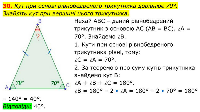 Кут при основі рівнобедреного трикутника дорівнює 70°. Знайдіть кут при вершині цього трикутника. Нехай АВС – даний рівнобедрений трикутник з основою АС (АВ = ВС). ∠А = 70°. Знайдемо ∠В. 1. Кути при основі рівнобедреного трикутника рівні, тому: ∠С = ∠А = 70°. 2. За теоремою про суму кутів трикутника знайдемо кут В: ∠А + ∠В + ∠С = 180°. ∠В = 180° – 2 • ∠А = 180° – 2 • 70° = 180° – 140° = 40°. Відповідь: 40°.