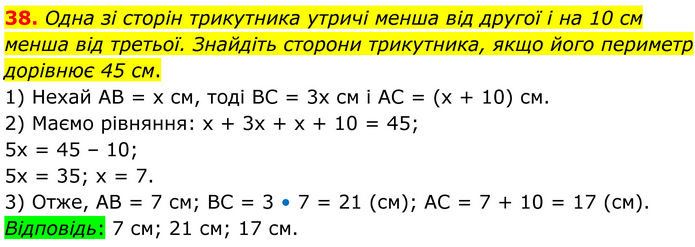 Одна зі сторін трикутника утричі менша від другої і на 10 см менша від третьої. Знайдіть сторони трикутника, якщо його периметр дорівнює 45 см. 1) Нехай AB = х см, тоді BC = 3х см і AC = (х + 10) см. 2) Маємо рівняння: x + 3x + x + 10 = 45; 5х = 45 – 10; 5х = 35; х = 7. 3) Отже, AB = 7 см; BC = 3 • 7 = 21 (см); AC = 7 + 10 = 17 (см). Відповідь: 7 см; 21 см; 17 см.