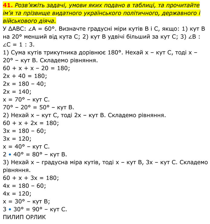 Розв’яжіть задачі, умови яких подано в таблиці, та прочитайте ім’я та прізвище видатного українського політичного, державного і військового діяча. У ΔABC: ∠A = 60°. Визначте градусні міри кутів B і C, якщо: 1) кут B на 20° менший від кута C; 2) кут B удвічі більший за кут C; 3) ∠B : ∠C = 1 : 3. 1) Сума кутів трикутника дорівнює 180°. Нехай х – кут С, тоді х – 20° – кут В. Складемо рівняння. 60 + х + х – 20 = 180; 2х + 40 = 180; 2х = 180 – 40; 2х = 140; х = 70° – кут С. 70° – 20° = 50° – кут В. 2) Нехай х – кут С, тоді 2х – кут В. Складемо рівняння. 60 + х + 2х = 180; 3х = 180 – 60; 3х = 120; х = 40° – кут С. 2 • 40° = 80° – кут В. 3) Нехай х – градусна міра кутів, тоді х – кут В, 3х – кут С. Складемо рівняння. 60 + х + 3х = 180; 4х = 180 – 60; 4х = 120; х = 30° – кут В; 3 • 30° = 90° – кут С. ПИЛИП ОРЛИК