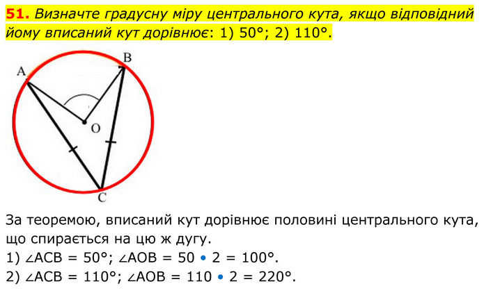 Визначте градусну міру центрального кута, якщо відповідний йому вписаний кут дорівнює: 1) 50°; 2) 110°. За теоремою, вписаний кут дорівнює половині центрального кута, що спирається на цю ж дугу. 1) ∠АСВ = 50°; ∠АОВ = 50 • 2 = 100°. 2) ∠АСВ = 110°; ∠АОВ = 110 • 2 = 220°.