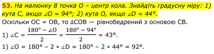 На малюнку 8 точка O – центр кола. Знайдіть градусну міру: 1) кута C, якщо ∠O = 94°; 2) кута O, якщо ∠D = 44°. Оскільки OС = OВ, то ∆СOВ — рівнобедрений з основою СВ. 1) ∠С = (180° - ∠О)/2 = (180° - 94°)/2 = 43°. 1) ∠O = 180° – 2 • ∠D = 180° – 2 • 44° = 92°.
