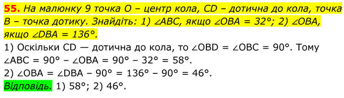 На малюнку 9 точка O – центр кола, CD – дотична до кола, точка B – точка дотику. Знайдіть: 1) ∠ABC, якщо ∠OBA = 32°; 2) ∠OBA, якщо ∠DBA = 136°. 1) Оскільки СD — дотична до кола, то ∠OBD = ∠OBC = 90°. Тому ∠ABC = 90° – ∠OBA = 90° – 32° = 58°. 2) ∠OBA = ∠DBA – 90° = 136° – 90° = 46°. Відповідь. 1) 58°; 2) 46°.