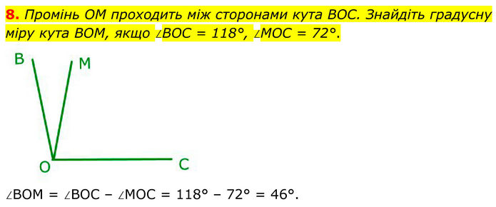 Промінь OM проходить між сторонами кута ВОС. Знайдіть градусну міру кута BOM, якщо ∠BOC = 118°, ∠MOC = 72°. ∠ВОМ = ∠ВОС – ∠МОС = 118° – 72° = 46°.
