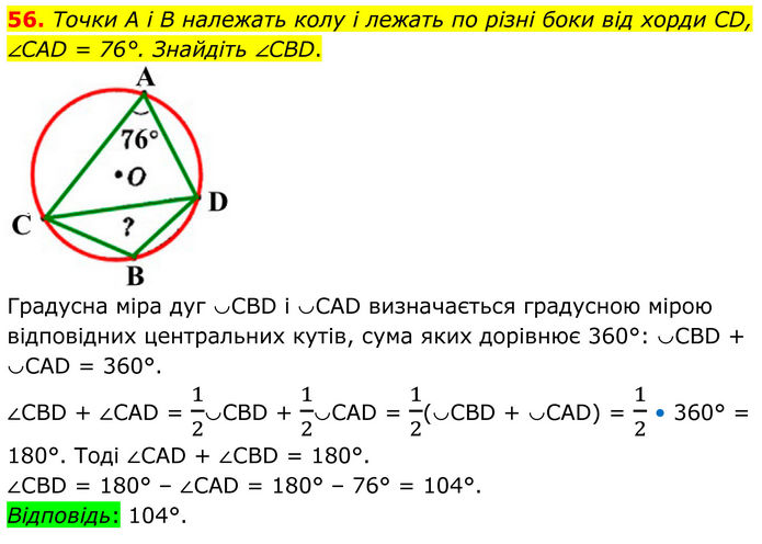 Точки A і B належать колу і лежать по різні боки від хорди CD, ∠CAD = 76°. Знайдіть ∠CBD. Градусна міра дуг ◡CBD і ◡CAD визначається градусною мірою відповідних центральних кутів, сума яких дорівнює 360°: ◡CBD + ◡CAD = 360°. ∠CBD + ∠CAD = 1/2◡CBD + 1/2◡CAD = 1/2(◡CBD + ◡CAD) = 1/2 • 360° = 180°. Тоді ∠CAD + ∠CBD = 180°. ∠CBD = 180° – ∠CAD = 180° – 76° = 104°. Відповідь: 104°.