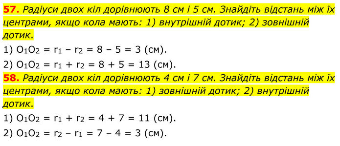 57. Радіуси двох кіл дорівнюють 8 см і 5 см. Знайдіть відстань між їх центрами, якщо кола мають: 1) внутрішній дотик; 2) зовнішній дотик. 1) O1O2 = r1 – r2 = 8 – 5 = 3 (см). 2) O1O2 = r1 + r2 = 8 + 5 = 13 (см). 58. Радіуси двох кіл дорівнюють 4 см і 7 см. Знайдіть відстань між їх центрами, якщо кола мають: 1) зовнішній дотик; 2) внутрішній дотик. 1) O1O2 = r1 + r2 = 4 + 7 = 11 (см). 2) O1O2 = r2 – r1 = 7 – 4 = 3 (см).