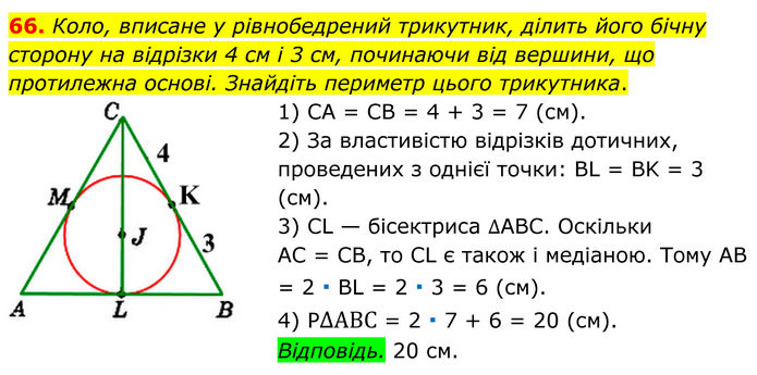 Коло, вписане у рівнобедрений трикутник, ділить його бічну сторону на відрізки 4 см і 3 см, починаючи від вершини, що протилежна основі. Знайдіть периметр цього трикутника. 1) CА = СВ = 4 + 3 = 7 (см). 2) За властивістю відрізків дотичних, проведених з однієї точки: BL = BK = 3 (см). 3) CL — бісектриса ∆ABC. Оскільки AC = CB, то CL є також і медіаною. Тому AB = 2 ∙ ВL = 2 ∙ 3 = 6 (см). 4) P∆АВС = 2 ∙ 7 + 6 = 20 (см). Відповідь. 20 см.