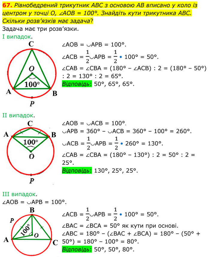Рівнобедрений трикутник ABC з основою AB вписано у коло із центром у точці O, ∠AOB = 100°. Знайдіть кути трикутника ABC. Скільки розв’язків має задача? Задача має три розв’язки. І випадок. ∠АОВ = ◡АРВ = 100°. ∠АСВ = 1/2◡АРВ = 1/2 • 100° = 50°. ∠САВ = ∠СВА = (180° – ∠АСВ) : 2 = (180° – 50°) : 2 = 130° : 2 = 65°. Відповідь: 50°, 65°, 65°. II випадок. ∠АОВ = ◡АСВ = 100°. ◡АРВ = 360° – ◡АСВ = 360° – 100° = 260°. ◡АСВ = 1/2◡АРВ = 1/2 • 260° = 130°. ∠САВ = ∠СВА = (180° – 130°) : 2 = 50° : 2 = 25°. Відповідь: 130°, 25°, 25°. III випадок. ∠АОВ = ◡АРВ = 100°. ∠АСВ = 1/2◡АРВ = 1/2 • 100° = 50°. ∠ВАС = ∠ВСА = 50° як кути при основі. ∠АВС = 180° – (∠ВАС + ∠ВСА) = 180° – (50° + 50°) = 180° – 100° = 80°. Відповідь: 50°, 50°, 80°.