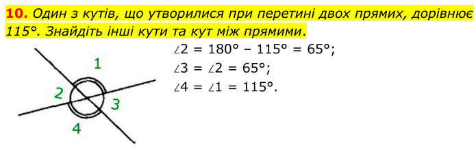 Один з кутів, що утворилися при перетині двох прямих, дорівнює 115°. Знайдіть інші кути та кут між прямими. ∠2 = 180° – 115° = 65°; ∠3 = ∠2 = 65°; ∠4 = ∠1 = 115°.