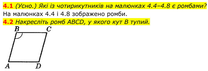 4.1 Які із чотирикутників на малюнках 4.4–4.8 є ромбами? На малюнках 4.4 і 4.8 зображено ромби. 4.2 Накресліть ромб ABCD, у якого кут B тупий.