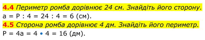 4.4 Периметр ромба дорівнює 24 см. Знайдіть його сторону. а = Р : 4 = 24 : 4 = 6 (см). 4.5 Сторона ромба дорівнює 4 дм. Знайдіть його периметр. P = 4а = 4 • 4 = 16 (дм).