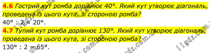 4.6 Гострий кут ромба дорівнює 40°. Який кут утворює діагональ, проведена із цього кута, зі стороною ромба? 40° : 2 = 20°. 4.7 Тупий кут ромба дорівнює 130°. Який кут утворює діагональ, проведена із цього кута, зі стороною ромба? 130° : 2 = 65°.