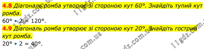 4.8 Діагональ ромба утворює зі стороною кут 60°. Знайдіть тупий кут ромба. 60° • 2 = 120°. 4.9 Діагональ ромба утворює зі стороною кут 20°. Знайдіть гострий кут ромба. 20° • 2 = 40°.