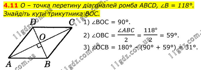 O – точка перетину діагоналей ромба ABCD, ∠B = 118°. Знайдіть кути трикутника BOC. 1) ∠BOC = 90°. 2) ∠OBC = (∠ABC)/2 = (118°)/2 = 59°. 3) ∠OCB = 180° – (90° + 59°) = 31°.