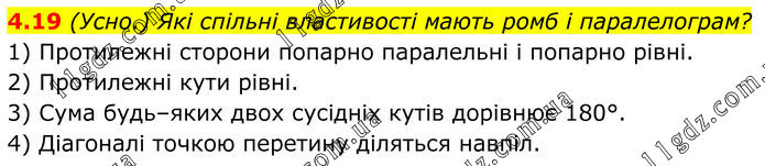 Які спільні властивості мають ромб і паралелограм? 1) Протилежні сторони попарно паралельні і попарно рівні. 2) Протилежні кути рівні. 3) Сума будь–яких двох сусідніх кутів дорівнює 180°. 4) Діагоналі точкою перетину діляться навпіл.