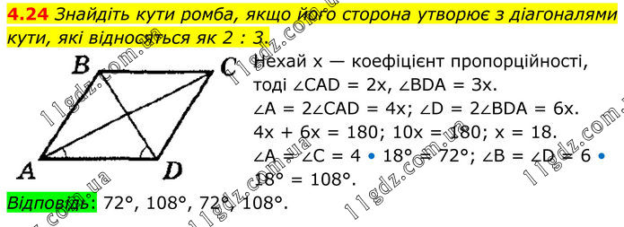 Знайдіть кути ромба, якщо його сторона утворює з діагоналями кути, які відносяться як 2 : 3. Нехай х — коефіцієнт пропорційності, тоді ∠САD = 2х, ∠ВDА = Зх. ∠А = 2∠САD = 4х; ∠D = 2∠ВDА = 6х. 4х + 6х = 180; 10x = 180; х = 18. ∠А = ∠С = 4 • 18° = 72°; ∠В = ∠D = 6 • 18° = 108°. Відповідь: 72°, 108°, 72°, 108°.