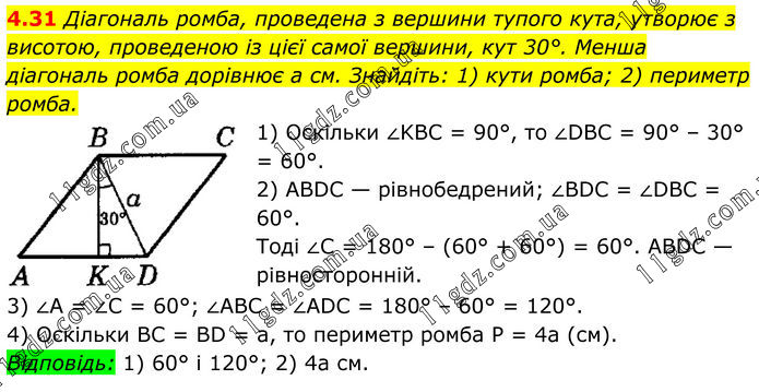 Діагональ ромба, проведена з вершини тупого кута, утворює з висотою, проведеною із цієї самої вершини, кут 30°. Менша діагональ ромба дорівнює а см. Знайдіть: 1) кути ромба; 2) периметр ромба. 1) Оскільки ∠KBC = 90°, то ∠DBC = 90° – 30° = 60°. 2) ABDC — рівнобедрений; ∠BDC = ∠DBC = 60°. Тоді ∠C = 180° – (60° + 60°) = 60°. ABDC — рівносторонній. 3) ∠A = ∠C = 60°; ∠ABC = ∠ADC = 180° – 60° = 120°. 4) Оскільки BC = BD = а, то периметр ромба P = 4а (см). Відповідь: 1) 60° і 120°; 2) 4а см.