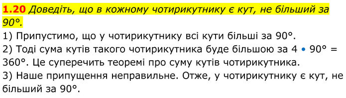 Доведіть, що в кожному чотирикутнику є кут, не більший за 90°. 1) Припустимо, що у чотирикутнику всі кути більші за 90°. 2) Тоді сума кутів такого чотирикутника буде більшою за 4 • 90° = 360°. Це суперечить теоремі про суму кутів чотирикутника. 3) Наше припущення неправильне. Отже, у чотирикутнику є кут, не більший за 90°.
