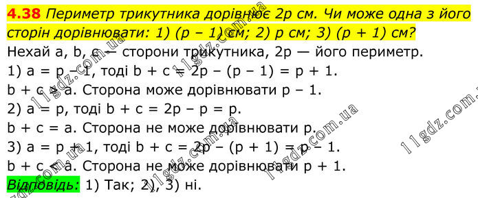 Периметр трикутника дорівнює 2р см. Чи може одна з його сторін дорівнювати: 1) (р – 1) см; 2) p см; 3) (р + 1) см? Нехай а, b, с — сторони трикутника, 2р — його периметр. 1) а = р – 1, тоді b + с = 2р – (р – 1) = р + 1. b + с > а. Сторона може дорівнювати р – 1. 2) а = р, тоді b + с = 2р – р = р. b + с = а. Сторона не може дорівнювати р. 3) а = р + 1, тоді b + с = 2р – (р + 1) = р – 1. b + с < а. Сторона не може дорівнювати р + 1. Відповідь: 1) Так; 2), 3) ні.