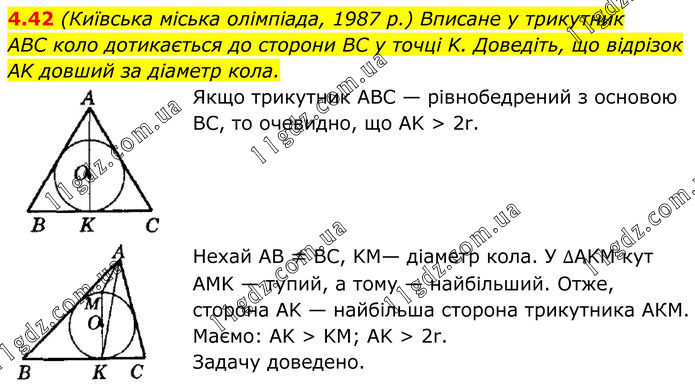 (Київська міська олімпіада, 1987 р.) Вписане у трикутник ABC коло дотикається до сторони BC у точці K. Доведіть, що відрізок AK довший за діаметр кола. Якщо трикутник ABC — рівнобедрений з основою BC, то очевидно, що AK > 2r. Нехай AB ≠ BC, KM— діаметр кола. У ∆AKM кут AMK — тупий, а тому — найбільший. Отже, сторона AK — найбільша сторона трикутника АКМ. Маємо: AK > KM; AK > 2r. Задачу доведено.