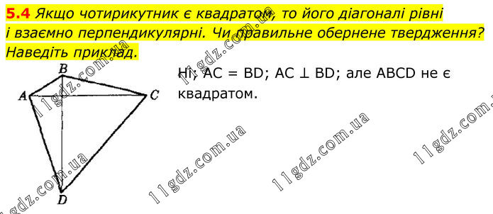 Якщо чотирикутник є квадратом, то його діагоналі рівні і взаємно перпендикулярні. Чи правильне обернене твердження? Наведіть приклад. Ні; AC = BD; AC ⊥ BD; але ABCD не є квадратом.
