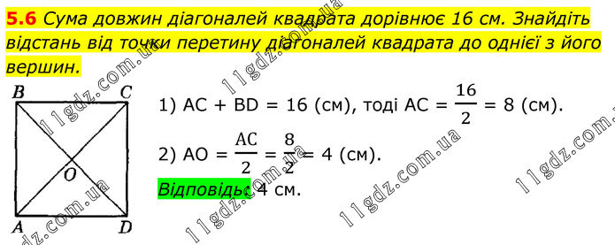 5.6 Сума довжин діагоналей квадрата дорівнює 16 см. Знайдіть відстань від точки перетину діагоналей квадрата до однієї з його вершин. 1) AC + BD = 16 (см), тоді АС = 16/2 = 8 (см). 2) АО = АС/2 = 8/2 = 4 (см). Відповідь: 4 см.