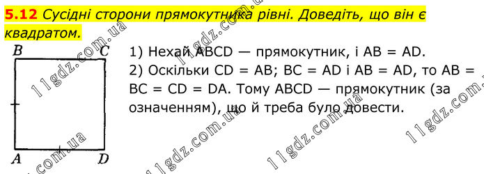 5.12 Сусідні сторони прямокутника рівні. Доведіть, що він є квадратом. 1) Нехай ABCD — прямокутник, і AB = AD. 2) Оскільки CD = AB; BC = AD i AB = AD, то AB = BC = CD = DA. Тому ABCD — прямокутник (за означенням), що й треба було довести.
