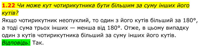 Чи може кут чотирикутника бути більшим за суму інших його кутів? Якщо чотирикутник неопуклий, то один з його кутів більший за 180°, а тоді сума трьох інших — менша від 180°. Отже, в цьому випадку один з кутів чотирикутника більший за суму інших його кутів. Відповідь: Так.