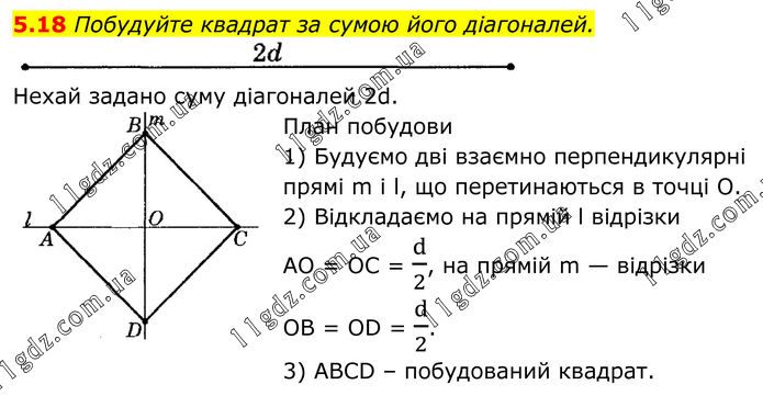 5.18 Побудуйте квадрат за сумою його діагоналей. Нехай задано суму діагоналей 2d. План побудови 1) Будуємо дві взаємно перпендикулярні прямі m і l, що перетинаються в точці О. 2) Відкладаємо на прямій l відрізки AO = OC = d/2, на прямій m — відрізки OB = OD = d/2. 3) ABCD – побудований квадрат.