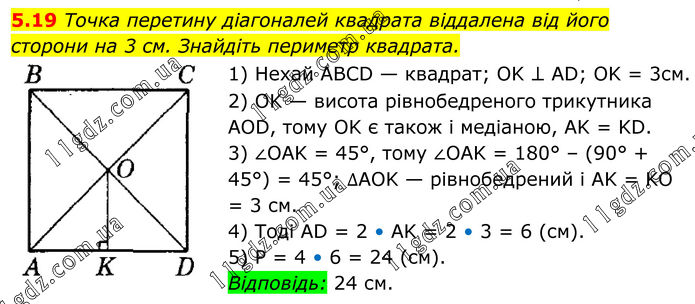 5.19 Точка перетину діагоналей квадрата віддалена від його сторони на 3 см. Знайдіть периметр квадрата. 1) Нехай ABCD — квадрат; OK ⊥ AD; OK = 3см. 2) OK — висота рівнобедреного трикутника AOD, тому OK є також і медіаною, AK = KD. 3) ∠OAK = 45°, тому ∠OAK = 180° – (90° + 45°) = 45°; ∆AOK — рівнобедрений і AK = KO = 3 см. 4) Тоді AD = 2 • AK = 2 • 3 = 6 (см). 5) P = 4 • 6 = 24 (см). Відповідь: 24 см.