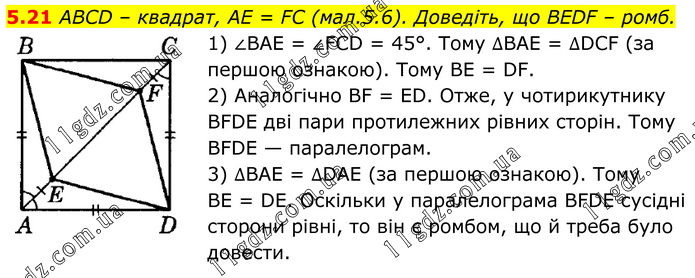 5.21 ABCD – квадрат, AE = FC (мал.5.6). Доведіть, що BEDF – ромб. 1) ∠BAE = ∠FCD = 45°. Тому ∆BAE = ∆DCF (за першою ознакою). Тому BE = DF. 2) Аналогічно BF = ED. Отже, у чотирикутнику BFDE дві пари протилежних рівних сторін. Тому BFDE — паралелограм. 3) ∆BAE = ∆DAE (за першою ознакою). Тому BE = DE. Оскільки у паралелограма BFDE сусідні сторони рівні, то він є ромбом, що й треба було довести.