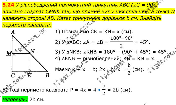 5.24 У рівнобедрений прямокутний трикутник ABC (∠C = 90°) вписано квадрат CMNK так, що прямий кут у них спільний, а точка N належить стороні AB. Катет трикутника дорівнює b см. Знайдіть периметр квадрата. 1) Позначимо CK = KN= х (см). 2) У ∆ABC: ∠A = ∠B = (180°-90°)/2 = 45°. 3) У ∆NKB: ∠KNB = 180° – (90° + 45°) = 45°. 4) ∆KNB — рівнобедрений; KB = KN = х. Маємо х + х = b; 2х= b; х = b/2 (см). 5) Тоді периметр квадрата P = 4х = 4 • b/2 = 2b (см). Відповідь: 2b см.