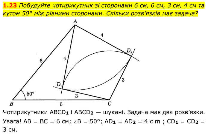 Побудуйте чотирикутник зі сторонами 6 см, 6 см, 3 см, 4 см та кутом 50° між рівними сторонами. Скільки розв’язків має задача? Чотирикутники ABCD1 і ABCD2 — шукані. Задача має два розв’язки. Увага! AB = BC = 6 см; ∠B = 50°; AD1 = AD2 = 4 c m ; CD1 = CD2 = 3 см.