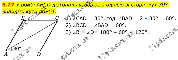 5.27 У ромбі ABCD діагональ утворює з однією зі сторін кут 30°. Знайдіть кути ромба. 1) ∠CAD = 30°, тоді ∠BAD = 2 • 30° = 60°. 2) ∠BCD = ∠BAD = 60°. 3) ∠B = ∠D= 180° – 60° = 120°.