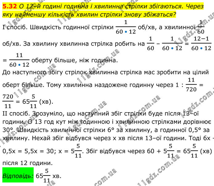 5.32 О 12–й годині годинна і хвилинна стрілки збігаються. Через яку найменшу кількість хвилин стрілки знову збіжаться? І спосіб. Швидкість годинної стрілки 1/(60 • 12) об/хв, а хвилинної 1/60 об/хв. Зa хвилину хвилинна стрілка робить на 1/60 – 1/(60 • 12) = (12-1)/(60 • 12) = 11/(60 • 12) оберту більше, ніж годинна. До наступного збігу стрілок хвилинна стрілка мас зробити на цілий оберт більше. Тому хвилинна наздожене годинну через 1 : 11/720 = 720/11 = 655/11 (хв). ІІ спосіб. Зрозуміло, що наступний збіг стрілки буде після 13–ої години. O 13 год кут між годинною і хвилинною стрілками дорівнює 30°. Швидкість хвилинної стрілки 6° за хвилину, а годинної 0,5° за хвилину. Нехай збіг відбувся через х хв після 13–ої години. Тоді 6х – 0,5х = 5,5х = 30; х = 55/11. Збіг відбувся через 60 + 55/11 = 655/11 (хв) після 12 години. Відповідь: 655/11 хв.