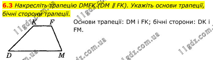 6.3 Накресліть трапецію DMFK (DM ∥ FK). Укажіть основи трапеції, бічні сторони трапеції. Основи трапеції: DM i FK; бічні сторони: DK і FM.