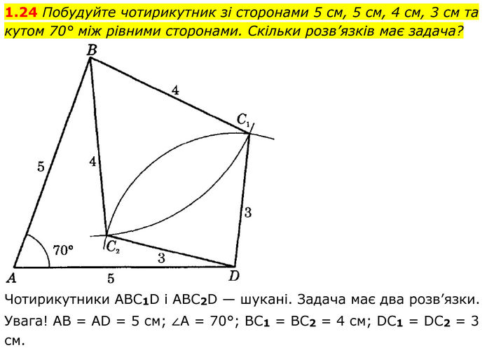 Побудуйте чотирикутник зі сторонами 5 см, 5 см, 4 см, 3 см та кутом 70° між рівними сторонами. Скільки розв’язків має задача? Чотирикутники ABC1D і ABC2D — шукані. Задача має два розв’язки. Увага! AB = AD = 5 см; ∠A = 70°; BC1 = BC2 = 4 см; DC1 = DC2 = 3 см.
