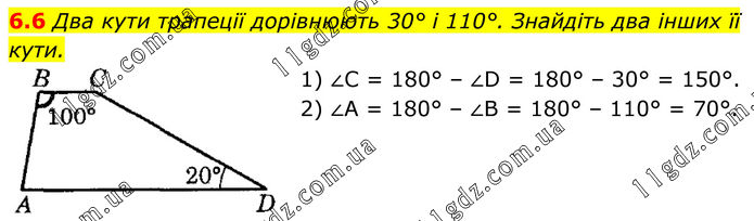 6.6 Два кути трапеції дорівнюють 30° і 110°. Знайдіть два інших її кути. 1) ∠C = 180° – ∠D = 180° – 30° = 150°. 2) ∠A = 180° – ∠B = 180° – 110° = 70°.