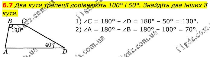 6.7 Два кути трапеції дорівнюють 100° і 50°. Знайдіть два інших її кути. 1) ∠C = 180° – ∠D = 180° – 50° = 130°. 2) ∠A = 180° – ∠B = 180° – 100° = 70°.