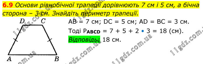 6.9 Основи рівнобічної трапеції дорівнюють 7 см і 5 см, а бічна сторона – 3 см. Знайдіть периметр трапеції. AB = 7 cм; DC = 5 cм; AD = BC = 3 см. Тоді PABCD = 7 + 5 + 2 • 3 = 18 (см). Відповідь: 18 см.