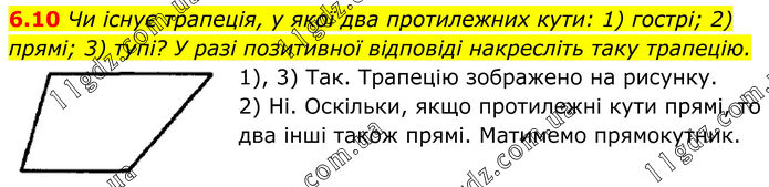6.10 Чи існує трапеція, у якої два протилежних кути: 1) гострі; 2) прямі; 3) тупі? У разі позитивної відповіді накресліть таку трапецію. 1), 3) Так. Трапецію зображено на рисунку. 2) Ні. Оскільки, якщо протилежні кути прямі, то два інші також прямі. Матимемо прямокутник.