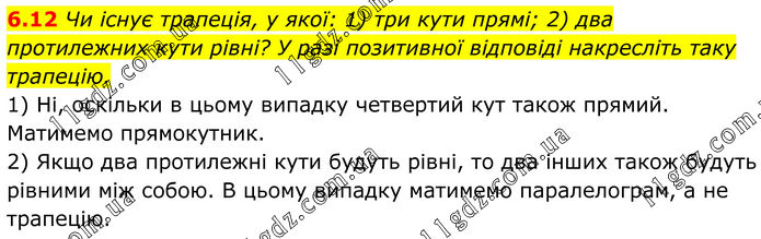 6.12 Чи існує трапеція, у якої: 1) три кути прямі; 2) два протилежних кути рівні? У разі позитивної відповіді накресліть таку трапецію. 1) Ні, оскільки в цьому випадку четвертий кут також прямий. Матимемо прямокутник. 2) Якщо два протилежні кути будуть рівні, то два інших також будуть рівними між собою. В цьому випадку матимемо паралелограм, а не трапецію.