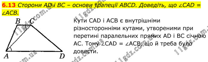 6.13 Сторони AD і BC – основи трапеції ABCD. Доведіть, що ∠CAD = ∠ACB. Кути CAD і ACB є внутрішніми різносторонніми кутами, утвореними при перетині паралельних прямих AD і BC січною AC. Тому ∠CAD = ∠АСВ, що й треба було довести.