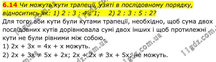 6.14 Чи можуть кути трапеції, узяті в послідовному порядку, відноситись як: 1) 2 : 3 : 4 : 1; 2) 2 : 3 : 5 : 2? Для того, аби кути були кутами трапеції, необхідно, щоб сума двох послідовних кутів дорівнювала сумі двох інших і щоб протилежні кути не були рівними між собою. 1) 2х + Зх = 4х + х можуть. 2) 2х + Зх ≠ 5х + 2х; 2х + 2х ≠ Зх + 5х; не можуть.