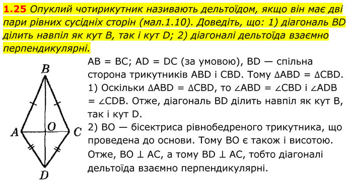 Опуклий чотирикутник називають дельтоїдом, якщо він має дві пари рівних сусідніх сторін (мал.1.10). Доведіть, що: 1) діагональ BD ділить навпіл як кут B, так і кут D; 2) діагоналі дельтоїда взаємно перпендикулярні. AB = BC; AD = DC (за умовою), BD — спільна сторона трикутників ABD і CBD. Тому ∆ABD = ∆CBD. 1) Оскільки ∆ABD = ∆CBD, то ∠ABD = ∠CBD і ∠ADB = ∠CDB. Отже, діагональ BD ділить навпіл як кут В, так і кут D. 2) BO — бісектриса рівнобедреного трикутника, що проведена до основи. Тому BO є також і висотою. Отже, BO ⊥ AC, а тому BD ⊥ AC, тобто діагоналі дельтоїда взаємно перпендикулярні.