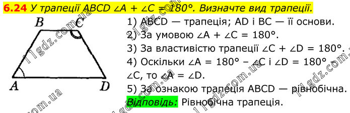 6.24 У трапеції ABCD ∠A + ∠C = 180°. Визначте вид трапеції. 1) ABCD — трапеція; AD і BC — її основи. 2) За умовою ∠A + ∠C = 180°. 3) За властивістю трапеції ∠C + ∠D = 180°. 4) Оскільки ∠A = 180° – ∠C і ∠D = 180° – ∠C, то ∠A = ∠D. 5) За ознакою трапеція ABCD — рівнобічна. Відповідь: Рівнобічна трапеція.