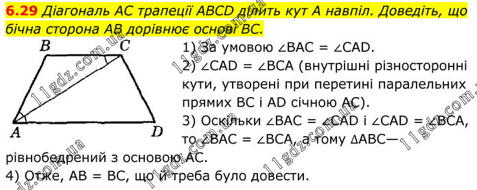 6.29 Діагональ AC трапеції ABCD ділить кут А навпіл. Доведіть, що бічна сторона AB дорівнює основі BC. 1) За умовою ∠BAC = ∠CAD. 2) ∠CAD = ∠BCA (внутрішні різносторонні кути, утворені при перетині паралельних прямих BC і AD січною AC). 3) Оскільки ∠BAC = ∠CAD і ∠CAD = ∠BCА, то ∠BAC = ∠BCА, а тому ∆ABC— рівнобедрений з основою AC. 4) Отже, AB = BC, що й треба було довести.