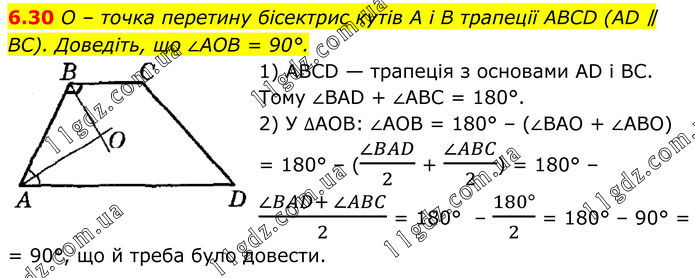 6.30 O – точка перетину бісектрис кутів А і B трапеції ABCD (AD ∥ BC). Доведіть, що ∠AOB = 90°. 1) ABCD — трапеція з основами AD і BC. Тому ∠BAD + ∠ABC = 180°. 2) У ∆АОВ: ∠AOB = 180° – (∠BAO + ∠ABО) = 180° – ((∠BAD)/2 + (∠ABC)/2) = 180° – (∠BAD+ ∠ABC)/2 = 180° – (180°)/2 = 180° – 90° = = 90°, що й треба було довести.