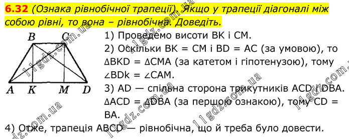 6.32 (Ознака рівнобічної трапеції). Якщо у трапеції діагоналі між собою рівні, то вона – рівнобічна. Доведіть. 1) Проведемо висоти BK і CM. 2) Оскільки BK = CM і BD = AC (за умовою), то ∆BKD = ∆CMA (за катетом і гіпотенузою), тому ∠BDk = ∠CAM. 3) AD — спільна сторона трикутників ACD і DBA. ∆ACD = ∆DBA (за першою ознакою), тому CD = BA. 4) Отже, трапеція ABCD — рівнобічна, що й треба було довести.