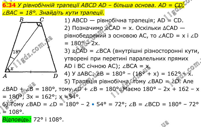6.34 У рівнобічній трапеції ABCD AD – більша основа. AD = CD, ∠BAC = 18°. Знайдіть кути трапеції. 1) ABCD — рівнобічна трапеція; AD = CD. 2) Позначимо ∠CAD = х. Оскільки ∆CAD — рівнобедрений з основою AC, то ∠ACD = х і ∠D = 180° – 2х. 3) ∠CAD = ∠BCA (внутрішні різносторонні кути, утворені при перетині паралельних прямих AD і BC січною AC); ∠BCA = х. 4) У ∆АВС: ∠B = 180° – (18° + х) = 162° – х. 5) Трапеція рівнобічна, тому ∠BAD = ∠D. Але ∠BAD + ∠B = 180°, тому ∠D + ∠B = 180°. Маємо 180° – 2x + 162 – x = 180°; Зх = 162°; х =54°. 6) Tому ∠BAD = ∠D = 180° – 2 • 54° = 72°; ∠B = ∠BCD = 180° – 72° = 108°. Відповідь: 72° і 108°.