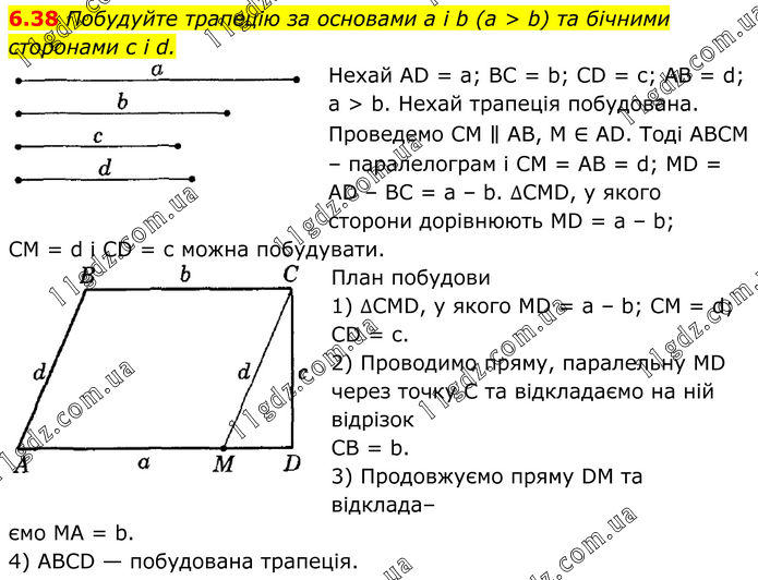 6.38 Побудуйте трапецію за основами а і b (а > b) та бічними сторонами c і d. Нехай AD = a; BC = b; CD = c; AB = d; a > b. Нехай трапеція побудована. Проведемо СМ ∥ АВ, М ∈ AD. Тоді АВСМ – паралелограм і СМ = АВ = d; MD = AD – BC = a – b. ∆CMD, у якого сторони дорівнюють MD = a – b; CM = d i CD = c можна побудувати. План побудови 1) ∆CMD, у якого MD = а – b; CM = d; CD = c. 2) Проводимо пряму, паралельну MD через точку C та відкладаємо на ній відрізок CB = b. 3) Продовжуємо пряму DM та відкладаємо MA = b. 4) ABCD — побудована трапеція.